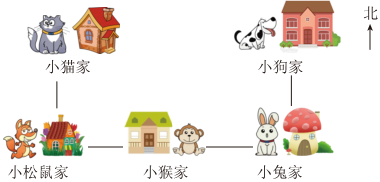 小猫家在小松鼠家的____面,小猴家的西面是____家,东面是____家,小狗家在小兔家的____面,小猴出门后先向西走,再向北走,可以到达____家。