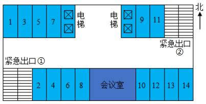 为了提高师生自护、自救能力,保证他们在紧急情况下能及时疏散,阳关小学举行了安全疏散演练活动。下面是三年级14个班所在教学楼的紧急疏散平面图(紧急疏散时不乘电梯)。假如遇到紧急情况,应该朝哪个方向走,回答下面问题。