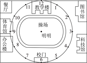 观察下图,明明站在操场上,面向教学楼。用“几点钟方向”介绍下面各建筑物的位置,正确的是( )。