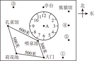 (2)孔雀馆在小胡的____点钟方向,熊猫馆在小胡的____点钟方向。